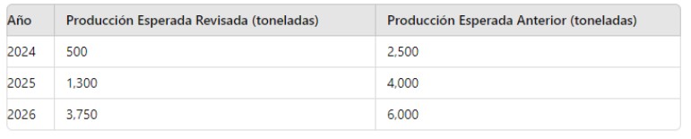 Este cuadro refleja los ajustes en las expectativas de producción de Kazatomprom para el proyecto conjunto JV Budenovskoye LLP, indicando reducciones significativas en comparación con las previsiones anteriores.