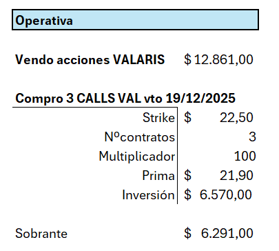 Llega el 19/12/2025 y ejerzo mi compra de call ITM (recordemos que no ejerceré únicamente si la cotización de Valaris se encontrara por debajo del strike, es decir, por debajo de 22,50 $. No ejerceré mi derecho a comprar a 22,50 $ algo que en el mercado puedo comprar más barato)