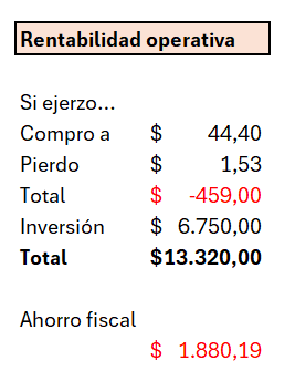 Por tanto, las nuevas 300 acciones que vuelvo a tener pero esta vez vía calls me cuestan 44,40 $ (21,90 $ de prima que pagué en diciembre de 2024 más los 22,50 $ que me cuestan ahora). Vendí POR MOR DE OPTIMIZAR FISCALMENTE a 42,87 $ y las vuelvo a comprar a 44,40 $. He “perdido” 1,53 $, que multiplicado por las 300 acciones me dan una cifra de 459 dólares.