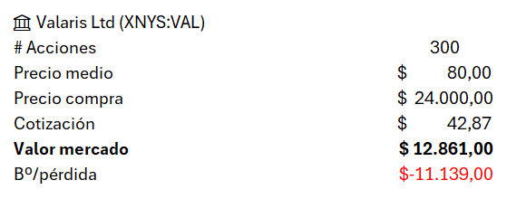 Vendo mis acciones de Valaris y por tanto me imputo la pérdida de los 11.139 dólares. Recibo por esa venta 12.861 dólares.