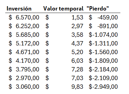 Pero, ¿y si hubieras mantenido las acciones? Habría bajado de cotización 32,87 $ que multiplicado por las 300 acciones que tenías hubiera supuesto 9.861 dólares, a los que habría que sumar los 1.880,19 dólares que NO te ahorraste fiscalmente. (No digo nada, pero sé que en tu mente está sonando otra vez el violín de Tamariz)
