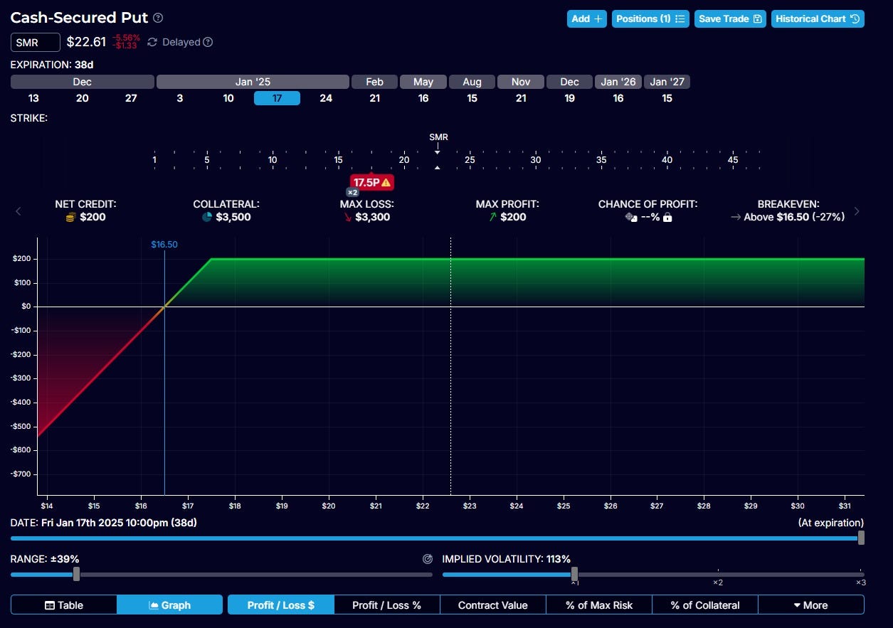 ya sabéis que una temática que ha funcionado muy bien en 2024 ha sido precisamente esta. Aprovecho al igual que con SMR una caída importante para posicionarme con venta de put.