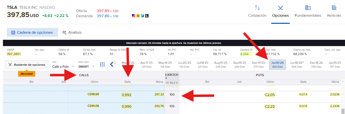 Vemos como el strike elegido está muy ITM. Es decir, si tuviéramos esa opción y decidiéramos ejercerla sería ganadora. Para saber esto, hagámonos siempre la siguiente pregunta: “¿Ejercería mi derecho a comprar acciones de Tesla a 100 $ cuando está cotizando en el mercado a 397 $?” La respuesta es obvia. Todo el mundo compraría a 100 algo que vale 400.