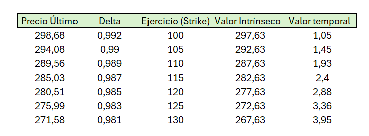 Pasemos estos datos a un excel y calculemos el valor intrínseco y el valor temporal de la prima: