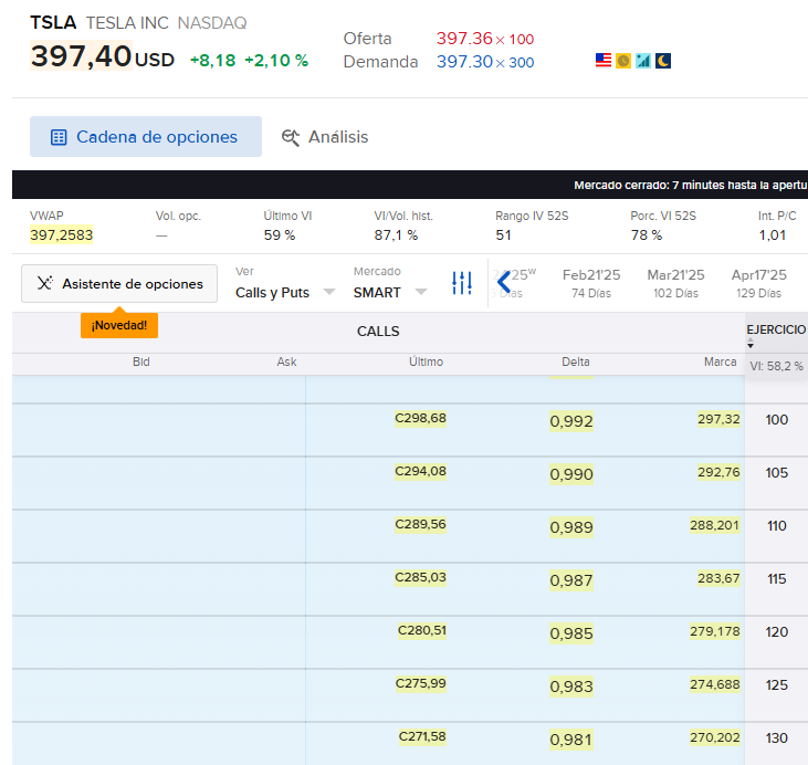 Pues ya sabemos que debemos buscar elegir aquellas opciones (strikes más bien) cuya Delta esté más próximo a 1. Recordemos el que seleccionábamos de Tesla y vemos como su Delta es de 0,992. Es decir, cuando las acciones de Tesla suban o bajen 1 $, nuestra posición subirá o bajará 0,992 $. Mágico ¿verdad?