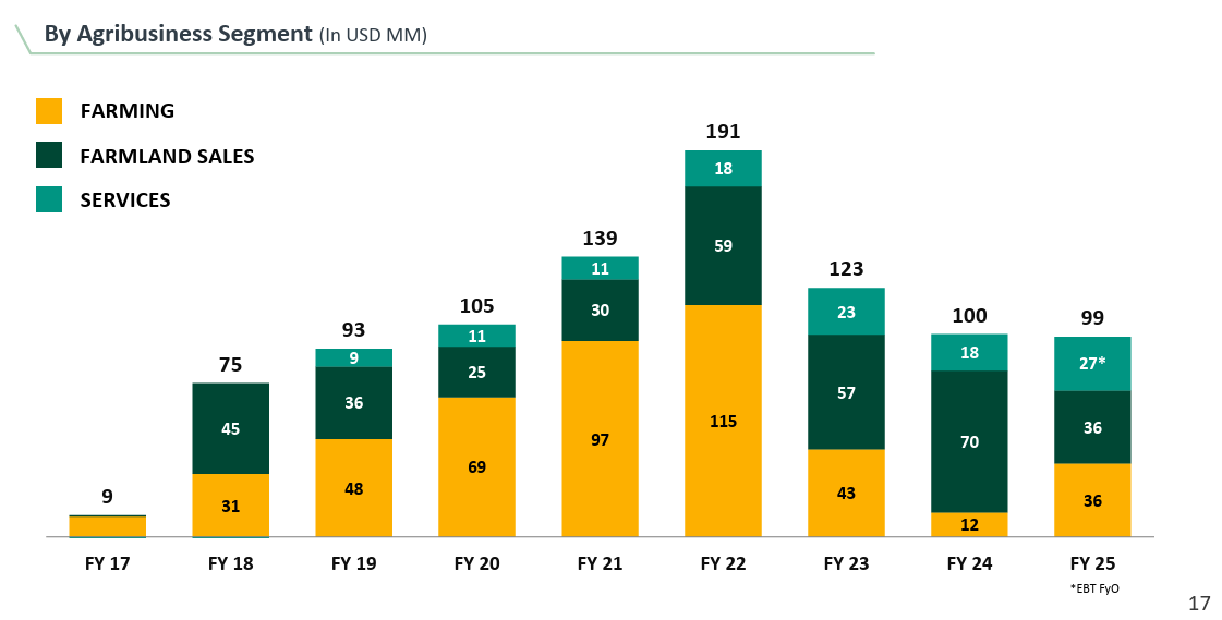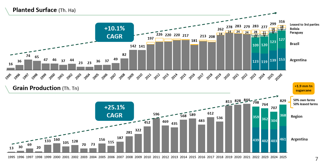 The operating backdrop for Cresud is beginning to turn in its favor after a long period of transition and headwinds. Soybean and corn prices, both in nominal and inflation-adjusted real terms, remain at historically low levels. In other words, the starting point is depressed, but volumes continue to grow — both in planted acreage and grain production — positioning the company well for the next turn of the cycle.
