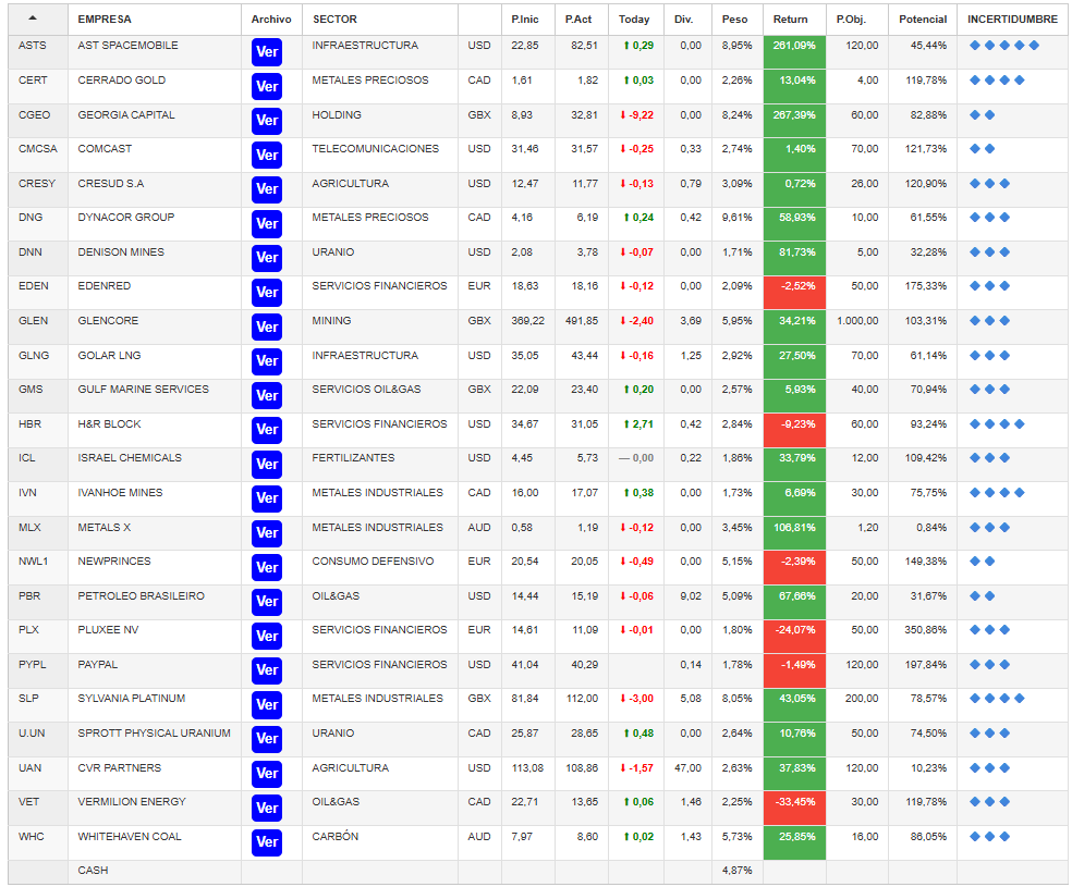 Year to date, the model portfolio is up +13.45%, versus -0.89% for the S&P 500 (S&P in euros), and +192.4% since inception (September 2022), compared with +48.9% for the S&P 500. The model portfolio, as of Friday’s close, is as follows: