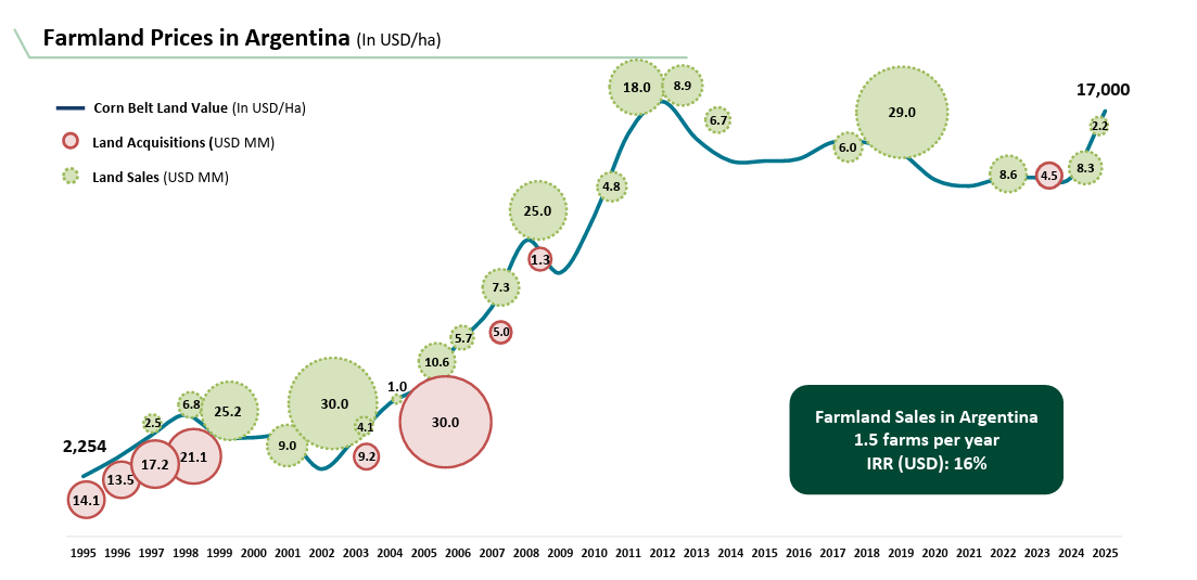 Cresud currently combines three compelling vectors: real assets in a context of macro normalization — which significantly enhances land values — operational improvement in livestock through greater production intensity, and a balance sheet that is beginning to reflect Argentina’s new exchange rate regime. In fact, although still depressed, agricultural land prices in Argentina are rising strongly and are beginning to approach parity with neighboring regions.