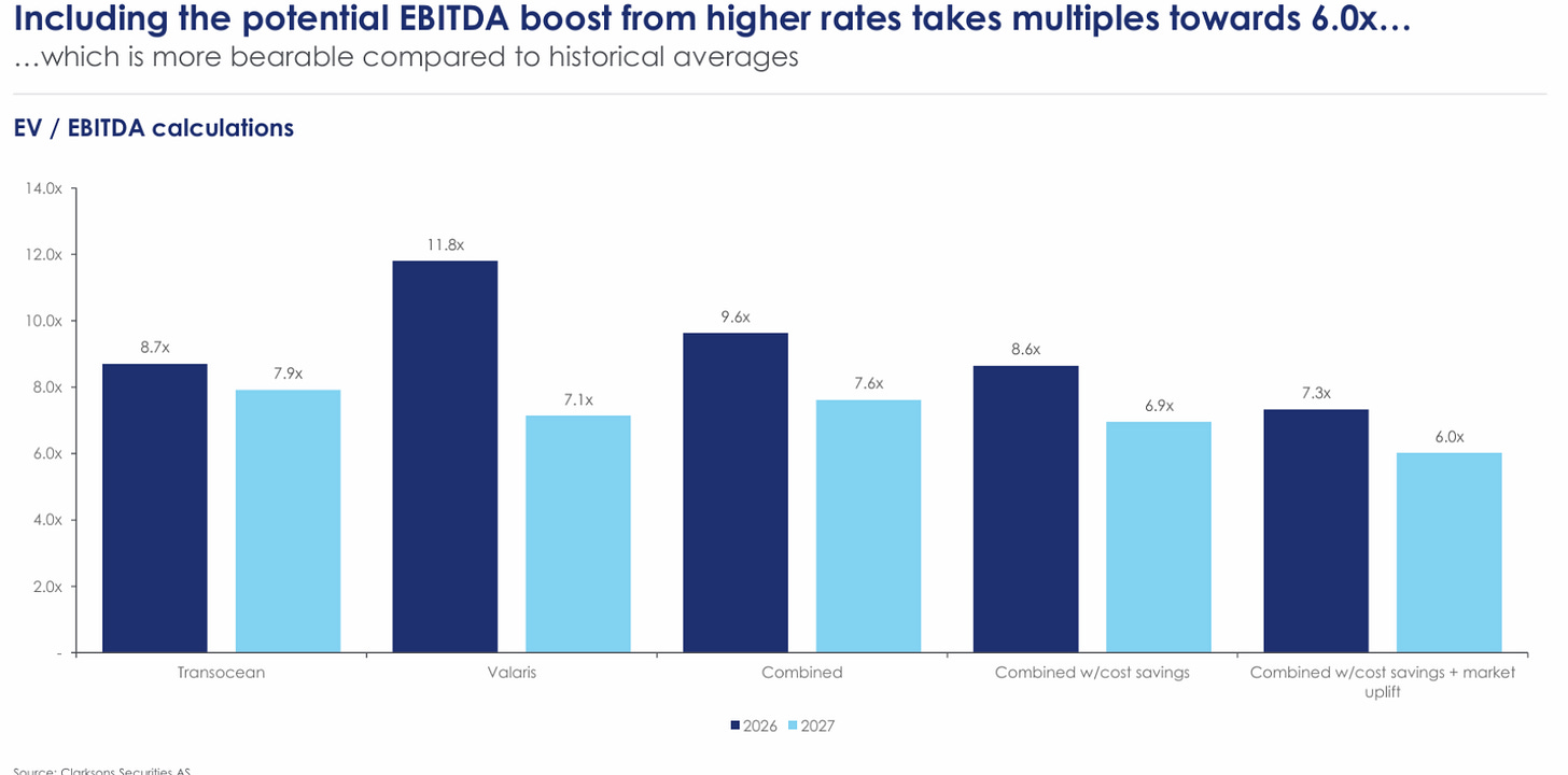From a strategic standpoint, the transaction has clear industrial logic. Transocean brings a dominant position in ultra-deepwater; Valaris complements it with meaningful exposure to jackups, particularly in the Middle East, where structural activity from NOCs supports utilization. The result is a rebuilt player capable of operating at any depth and in any relevant basin, from the deepwater “golden triangle” to the shallow waters of the Gulf and the Middle East. The company estimates cost synergies in excess of $200 million, in addition to Transocean’s ongoing cost reduction plan (more than $250 million accumulated through 2026). In theory, greater scale should translate into higher operational efficiency, stronger bargaining power with suppliers and customers, and, above all, sufficient pro forma cash generation to accelerate deleveraging toward a target ratio of 1.5x within 24 months.